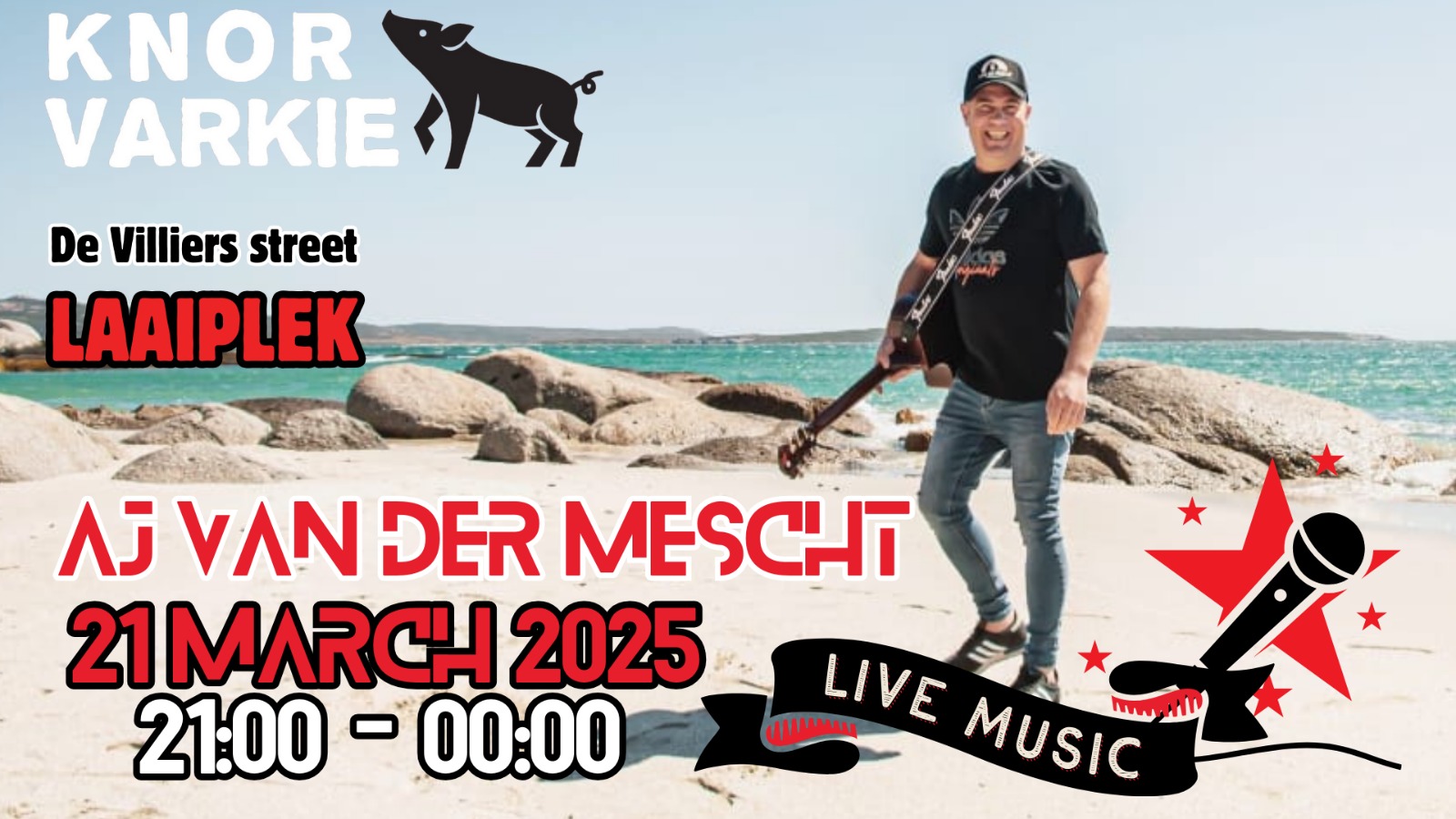 AJ van der Mescht Live AJ van der Mescht Live + Add to Google Calendar + iCal / Outlook export Date Mar 21 2025 Expired! Time 9:00 pm - 11:55 pm Location Knor Varkie Laaiplek De Villiers St, Laaiplek, Velddrif Category Knor Varkie Laai Plek Live Music Share this event