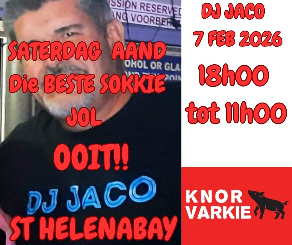 DJ Jaco Live DJ Jaco Live + Add to Google Calendar + iCal / Outlook export Date Feb 07 2026 Expired! Time 6:00 pm - 11:00 pm Location Knor Varkie St Helena Bay De Palm Lifestyle Centre, 7 Shearwater St, Britannica Heights, St Helena Bay Category Harbour Light Lounge Knor Varkie St Helena Bay Live DJ Share this event