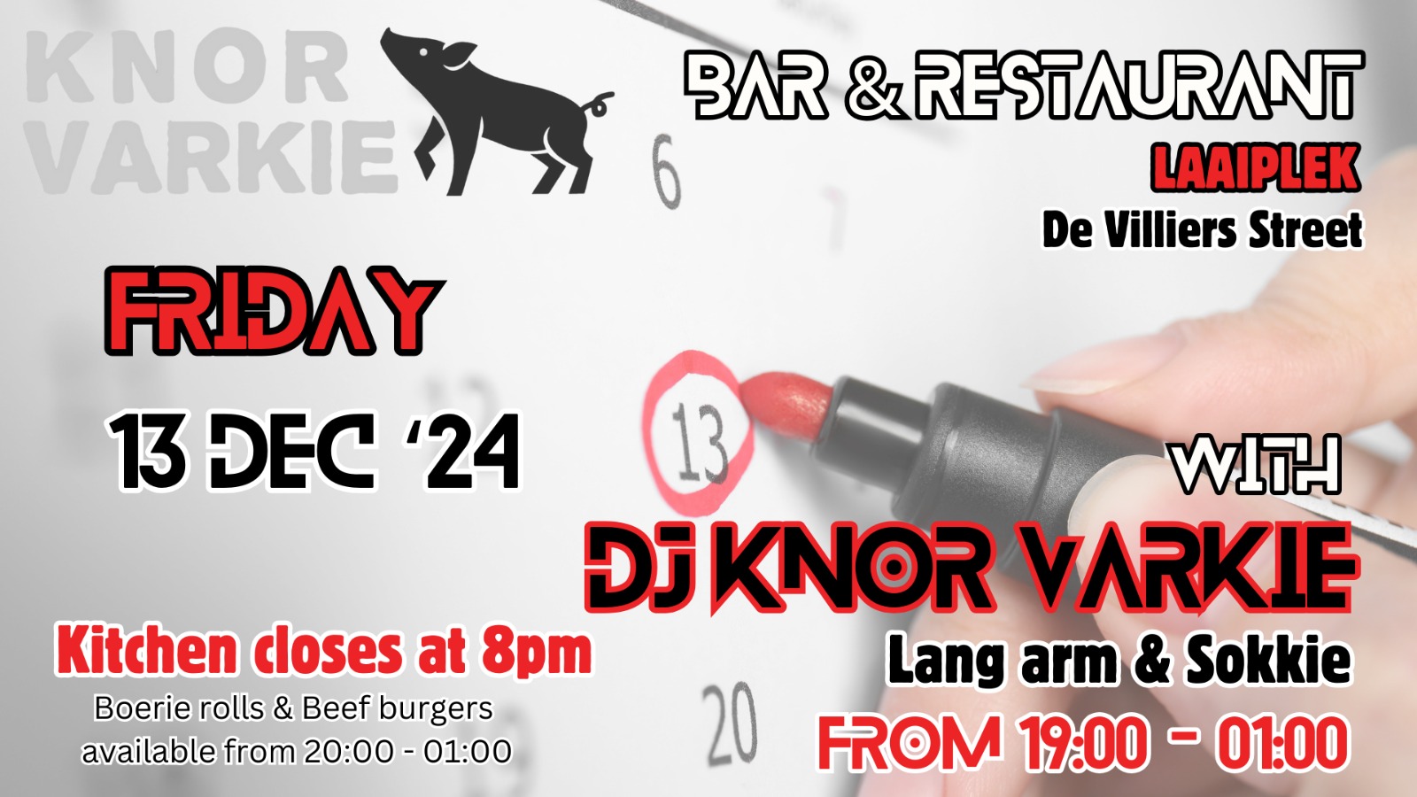 DJ Knorvarkie Lang Arm en Sokkie DJ Knorvarkie Lang Arm en Sokkie + Add to Google Calendar + iCal / Outlook export Date Dec 13 - 14 2024 Expired! Time 7:00 pm - 1:00 am Location River Shack @ Knor Varkie Velddrift Category Knor Varkie Laai Plek Live DJ Share this event