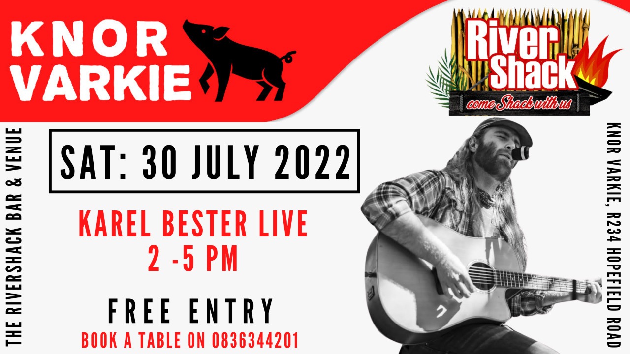 Karel Bester Live Karel Bester Live + Add to Google Calendar + iCal / Outlook export Date Jul 30 2022 Expired! Time 2:00 pm - 5:00 pm Location River Shack @ Knor Varkie Velddrift Category Live Music Share this event