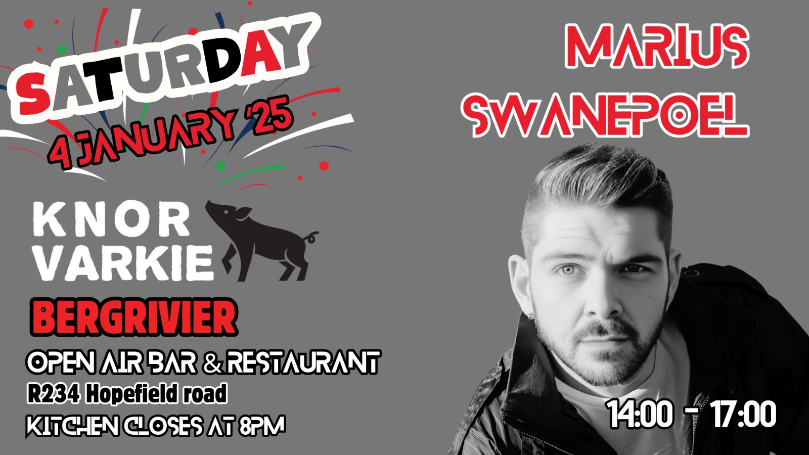 Marius Swanepoel Live Marius Swanepoel Live + Add to Google Calendar + iCal / Outlook export Date Jan 04 2025 Expired! Time 2:00 pm - 5:00 pm Location River Shack @ Knor Varkie Velddrift Category Live Music River Shack Share this event
