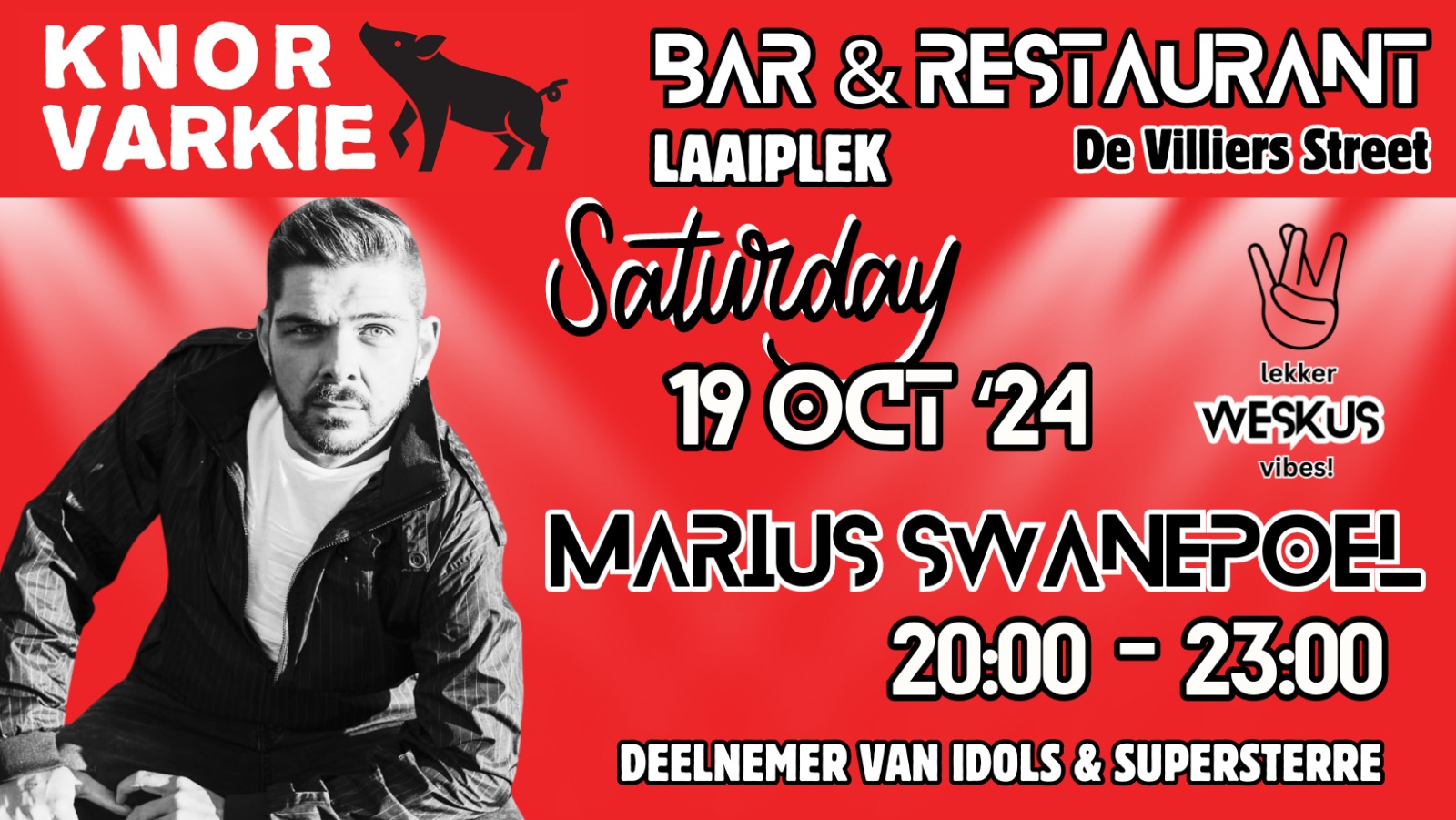 Marius Swanepoel Live Marius Swanepoel Live + Add to Google Calendar + iCal / Outlook export Date Oct 19 2024 Expired! Time 8:00 pm - 11:00 pm Location Knor Varkie Laaiplek De Villiers St, Laaiplek, Velddrif Category Knor Varkie Laai Plek Live Music Share this event