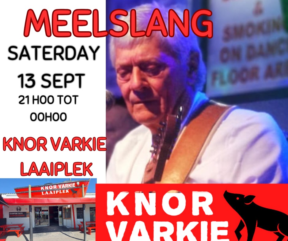 Meelslang Live Meelslang Live + Add to Google Calendar + iCal / Outlook export Date Sep 13 2025 Expired! Time 9:00 pm - 11:55 pm Location Knor Varkie Laaiplek De Villiers St, Laaiplek, Velddrif Category Knor Varkie Laai Plek Live Music Share this event