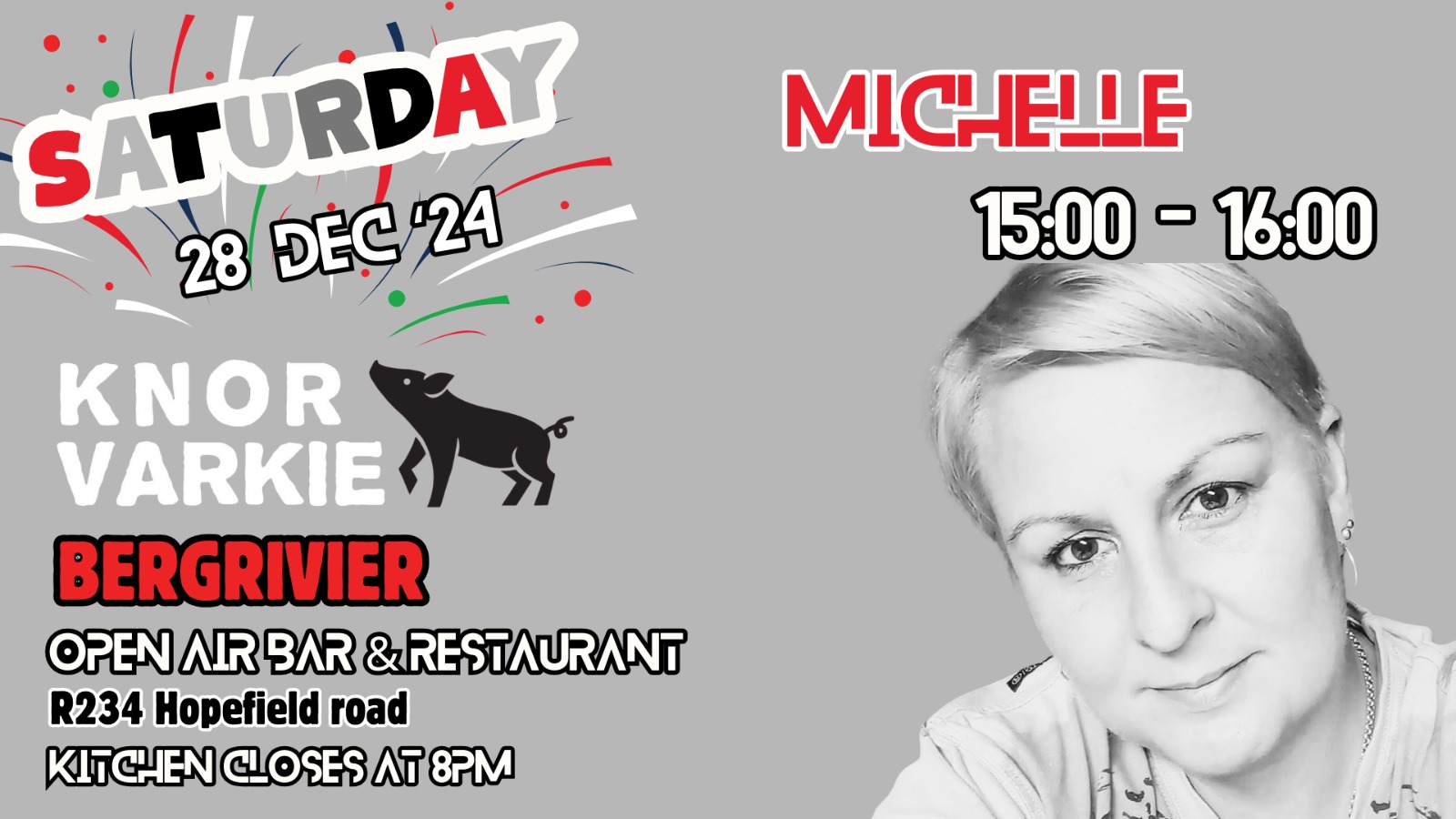 Michelle Live Michelle Live + Add to Google Calendar + iCal / Outlook export Date Dec 28 2024 Expired! Time 8:00 am - 6:00 pm Location River Shack @ Knor Varkie Velddrift Category Live Music River Shack Share this event
